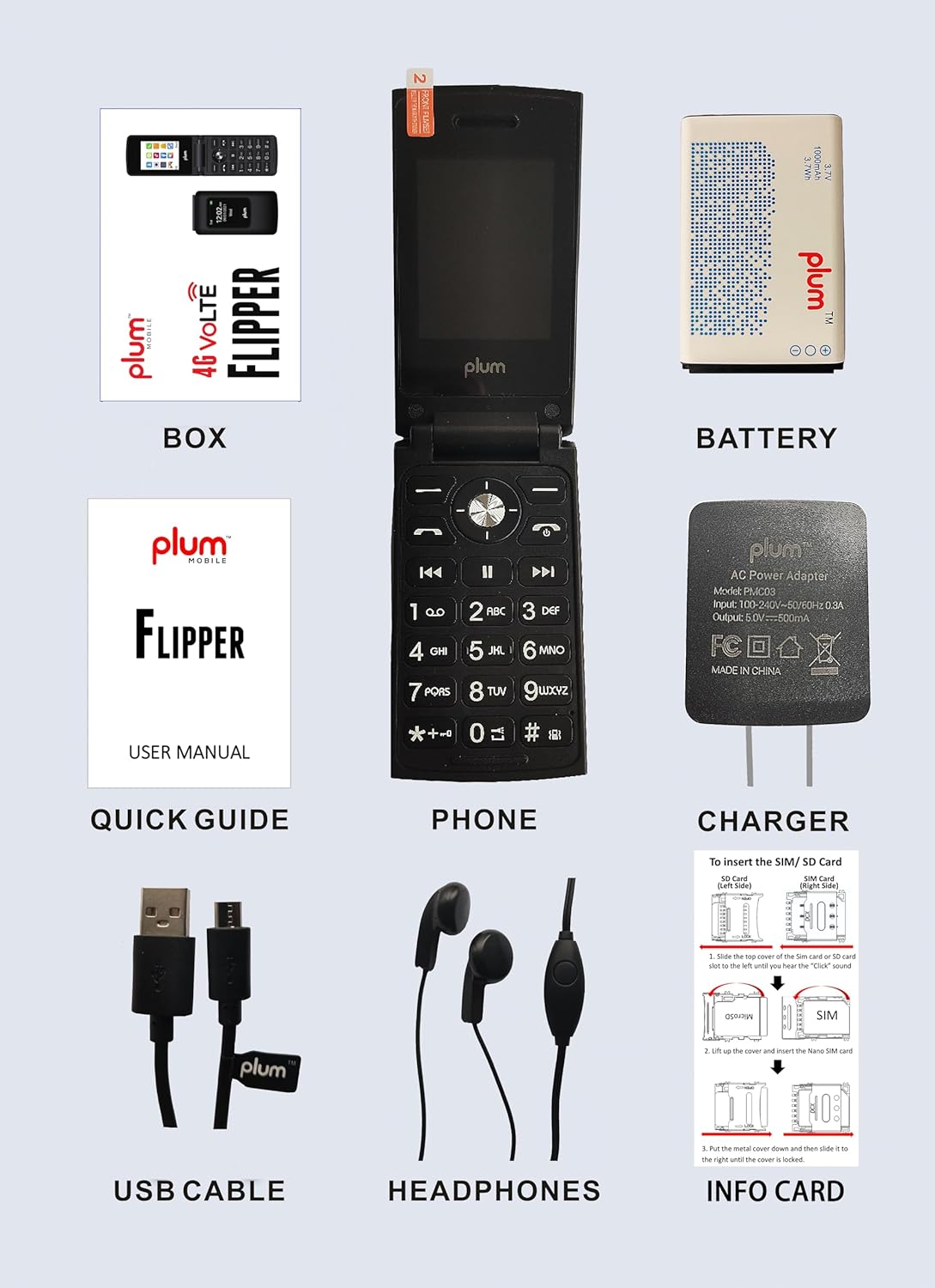 Plum Flipper is a 4G VoLTE (Voice Over LTE) latest Technology Factory Unlocked phone. Compatible with ATT, Tmobile, Speed Talk, Consumer Cellular, Mint, Ting, Walmart Family Mobile. Not Compatible with Verizon, Straight Talk and Boost It is also equipped with camera, flash light, FM Radio, loud speaker for handsfree calls, MP3 player, Bluetooth, Alarm, Facebook app and internet access. It comes with a 1000 mAh Battery that will last you all day of use or 4-5 days of stand-by time.it includes a handsfree cable, charger, USB cable and a quick guide.it also includes 1 Year US Warranty and a life time tech support from our US Base tech team. Comes ready out of the box. Remove the activated nano size sim card from your old phone install it into your new Plum Flipper 4G phone. ALL SET. Easy to Setup and easy to use. Big Display, Easy Menu, Big Keypad, External Display with indicator for missed calls, messages or Voice mail. The external display also shows time, date battery meter, signal etc so you have access to all important information without opening the flip.