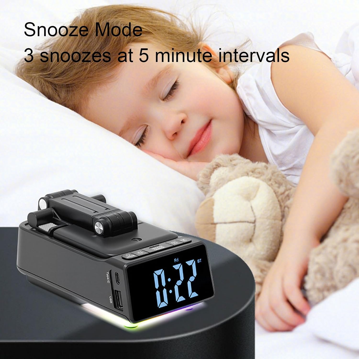 Adjustable Stand with 180° Rotation: The alarm clock bluetooth speaker features a freely adjustable mechanism that supports 180° rotation, allowing for convenient use at various angles to meet your viewing preferences.