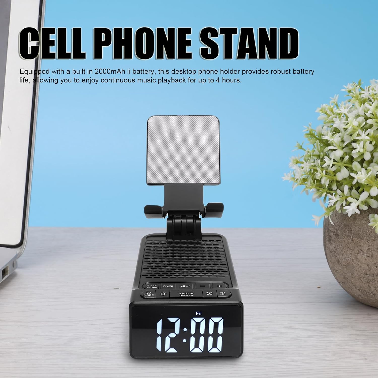 Powerful 2000mAh Battery: Phone stand speaker, equipped with a built in 2000mAh li battery, this desktop phone holder provides robust battery life, allowing you to enjoy continuous music playback for up to 4 hours.