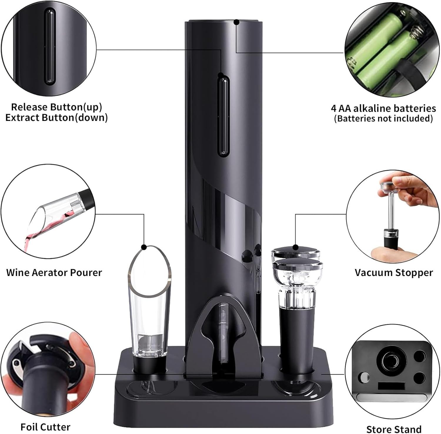 【Powerful & Durable】Powered by batteries (not included), this wine bottle opener is with a powerful and fast cork removal function. All tools are made of premium materials, bringing you a better using experience.