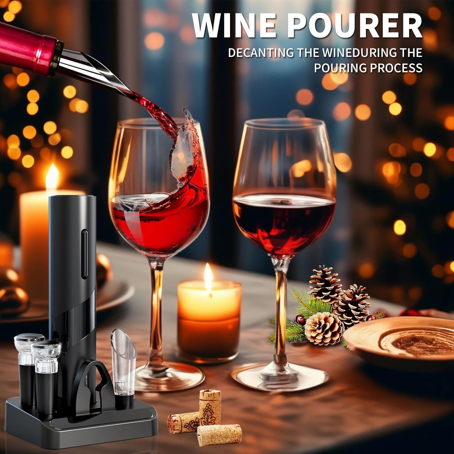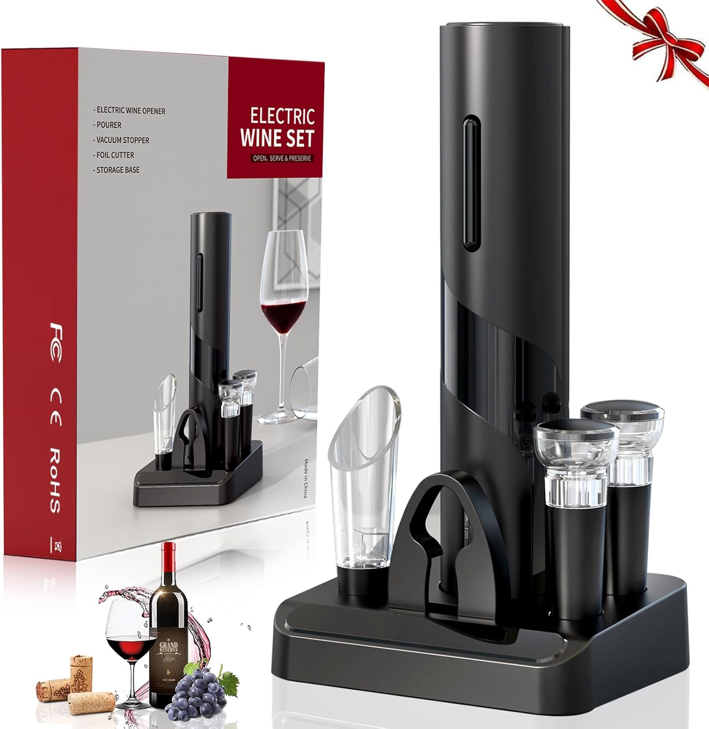 Pomefar Electric Wine Opener, Wine Corkscrew Wine Bottle Opener with Foil Cutter, 2 Vacuum Stoppers, Wine Pourer, Automatic Wine Opener 4-in-1 Gift Set for Wine Lover Kitchen Party Home