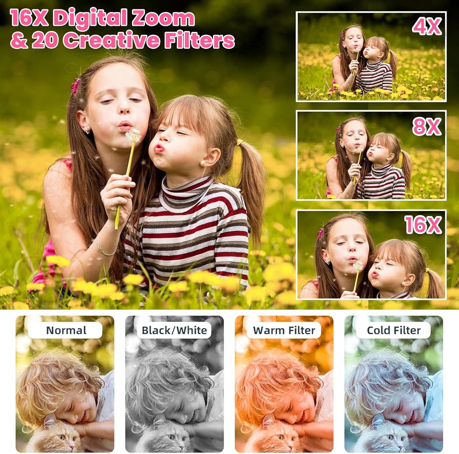 Capture High-Clarity Image: This point and shoot digital camera takes FHD 44MP images and 1080P video, producing natural colors with vivid and clear details. With a 16x digital zoom and 20 various filters, this digital camera for kids allows you to capture crisp, clear images even from a distance and gives you different photography experiences.