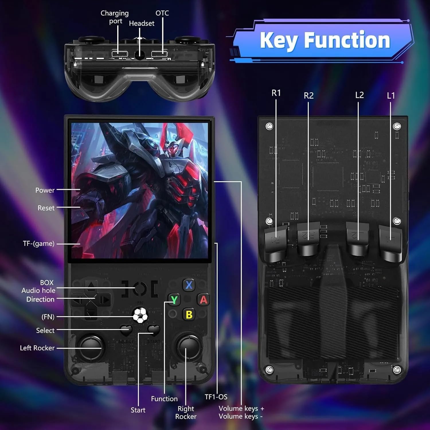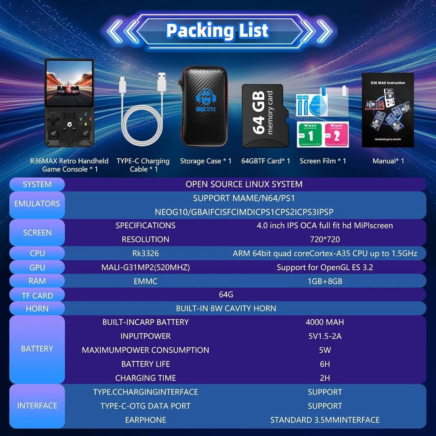 Product Description R36 Max is a compact retro handheld with 22,000+ games and a 4.0″ full-laminated IPS display (720×720) for sharp, vibrant visuals. The Linux-based OS delivers smooth, stable performance, while separated ABXY buttons, an ergonomic grip, and dual stereo speakers keep gameplay comfortable at home or on the go. Save/load states, HDMI output, and external-controller support make it a versatile choice for classic gaming. Key Features 4.0″ Full-Laminated IPS Screen: 720×720 resolution for crisp detail and wide viewing angles. Smooth, Stable Performance: Linux-based system tuned for reliable, low-latency gameplay. Comfortable Controls: Separated ABXY buttons, responsive D-pad, and ergonomic design. Immersive Audio: Dual stereo speakers for clear in-game sound. Play Your Way: Save/load states, HDMI TV-out, and support for external controllers.