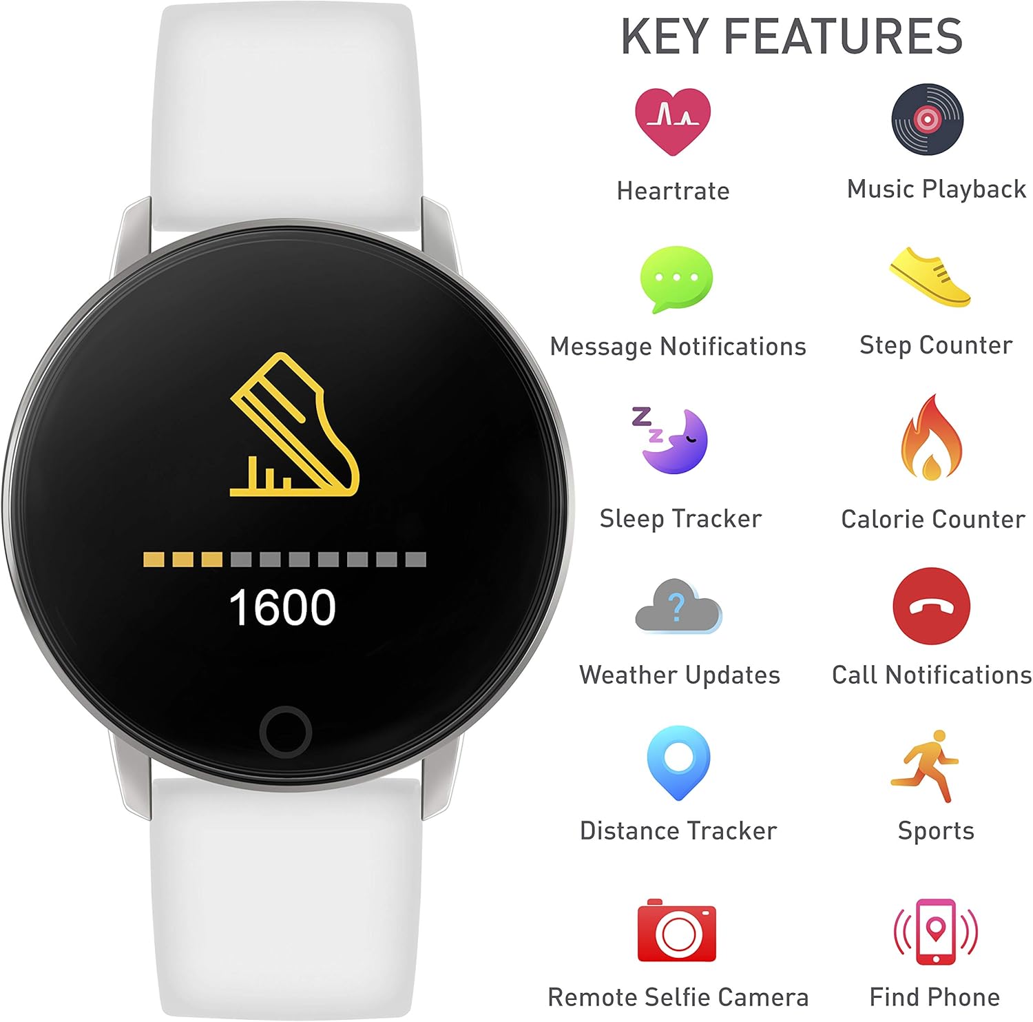 Distance/steps/calorie tracking, live weather updates from your watch, selfie camera control, find your phone function, track your sleep, alarm and reminders