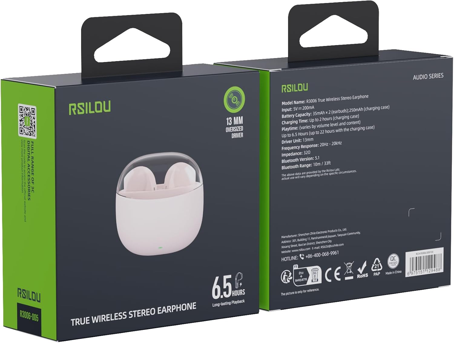 RSILOU – R3006- True Wireless Stereo Earphones, 13mm Driver, 6.5 Hours Playtime, Bluetooth 5.1 (Rose)