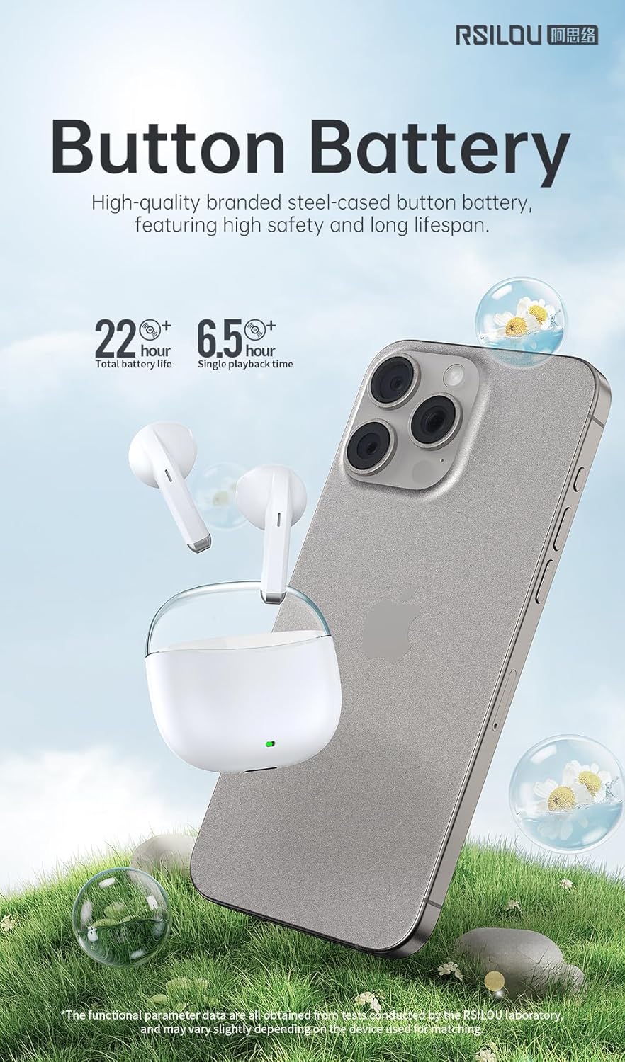 Experience superior sound quality with RSILOU R3006 True Wireless Stereo Earphones. Featuring powerful 13mm oversized drivers, these earphones deliver impressive audio performance across a wide frequency range of 20Hz – 20kHz. With Bluetooth 5.1 technology, enjoy stable wireless connectivity up to 10 metres. The earphones offer up to 6.5 hours of continuous playback on a single charge, while the charging case extends total listening time to 22 hours. The sleek white design with a transparent top case provides both style and functionality. Quick charging capability powers up the case in just 2 hours, while each earbud contains a 350mAh battery. The 32Ω impedance ensures optimal power efficiency and sound quality. Perfect for daily commutes, workouts, or casual listening, these earphones combine modern technology with practical features for an enhanced audio experience. The compact charging case with LED indicator makes storage and charging convenient, while maintaining portability.