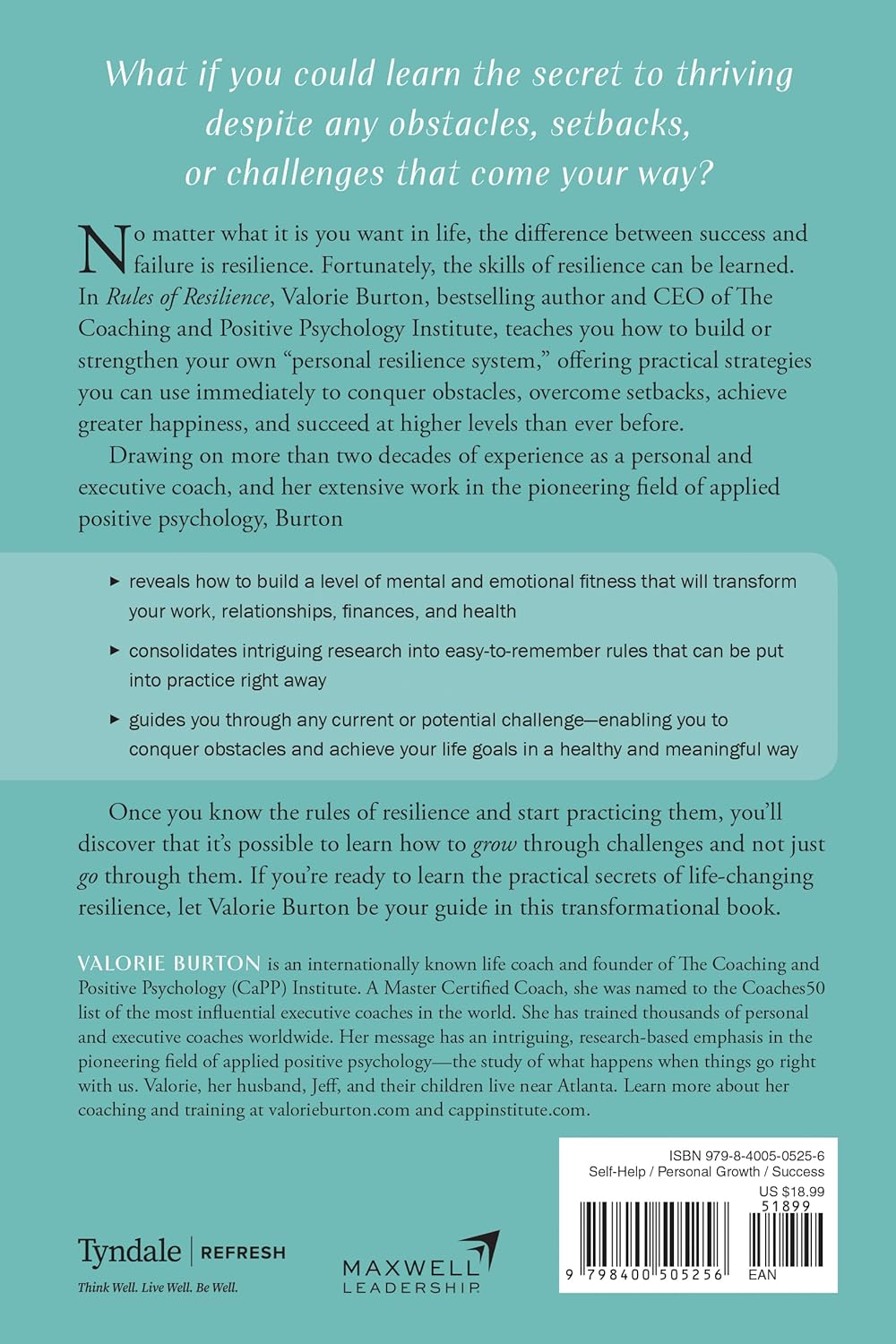 reveals how to build a level of mental and emotional fitness and strength that will transform your work, relationships, finances, and healthconsolidates intriguing research into easy-to-remember rules that can be put into practice right awayguides readers through any current or potential challenge–enabling them to conquer obstacles and achieve their life goals in a healthy and meaningful way.Once you know the rules of resilience and start practicing them, you’ll discover that it’s possible to learn how to grow through challenges and not just go through them. If you’re ready to learn the secrets of life-changing resilience, let Valorie Burton be your guide in this transformational book.