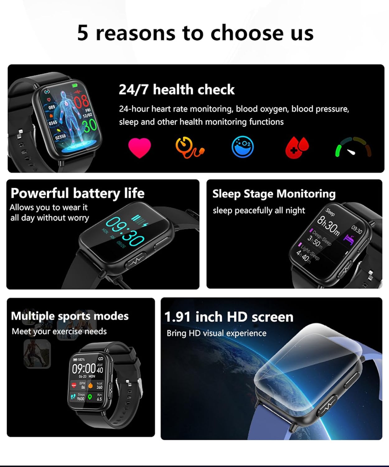 💧1.91 inch Large Screen & Water Resistant – With a 1.91 inch screen, this smart watch allows for clear time and data display, even in bright sunlight. It is also IP68 waterproof rated, making it safe for everyday use and swimming. (Note: not suitable for diving or sauna use).