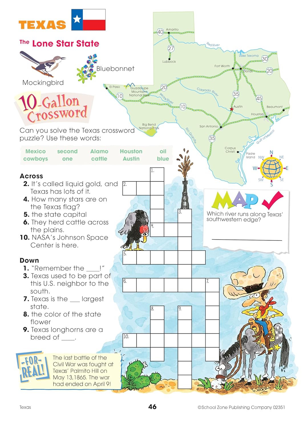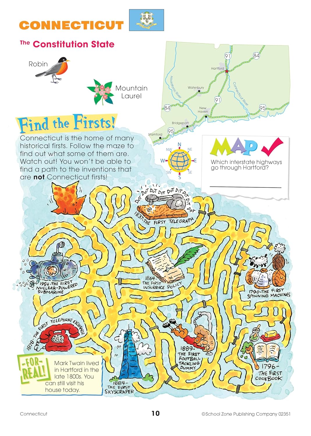 Fun way to learn about all 50 states. Pages come with a fact about each state, each stages flower, capital, bird history. Has fun little mazes and word searches. My 8 year old really enjoys learning from this book.