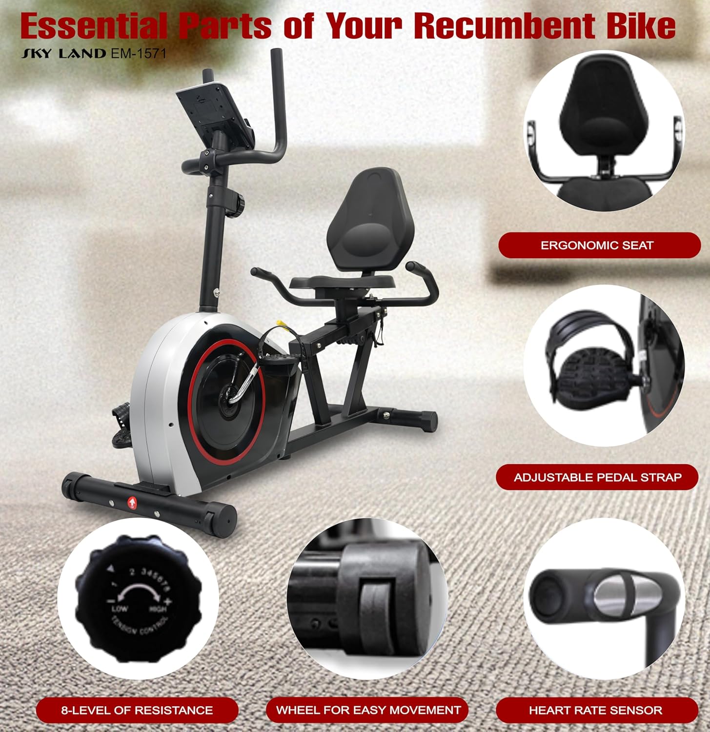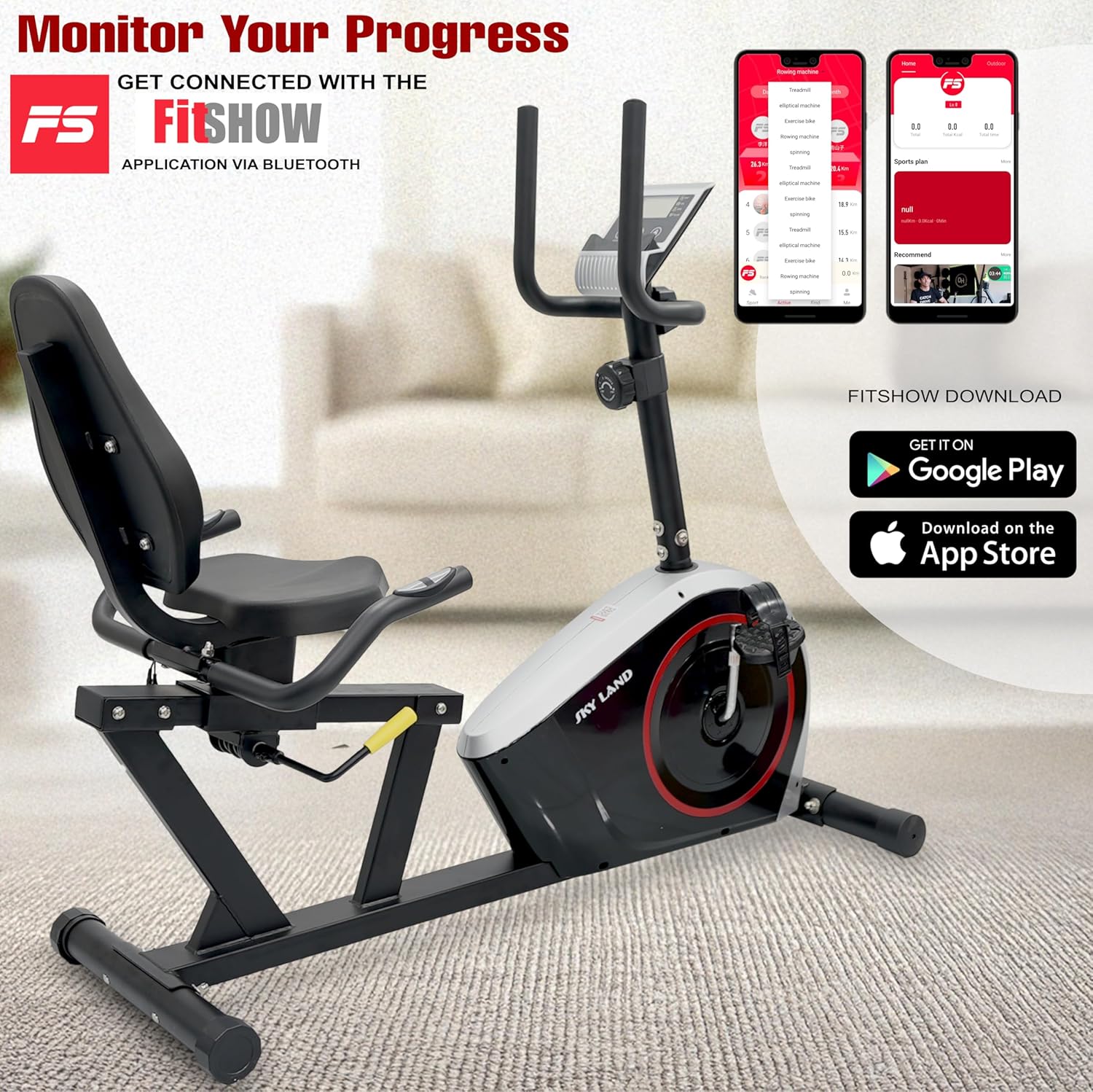 SKY LAND Recumbent Exercise Bike with 8-Level Magnetic Resistance, 2-Way Flywheel, Adjustable Seat, Digital Display, and Workout App Compatibility for Home Gym Fitness