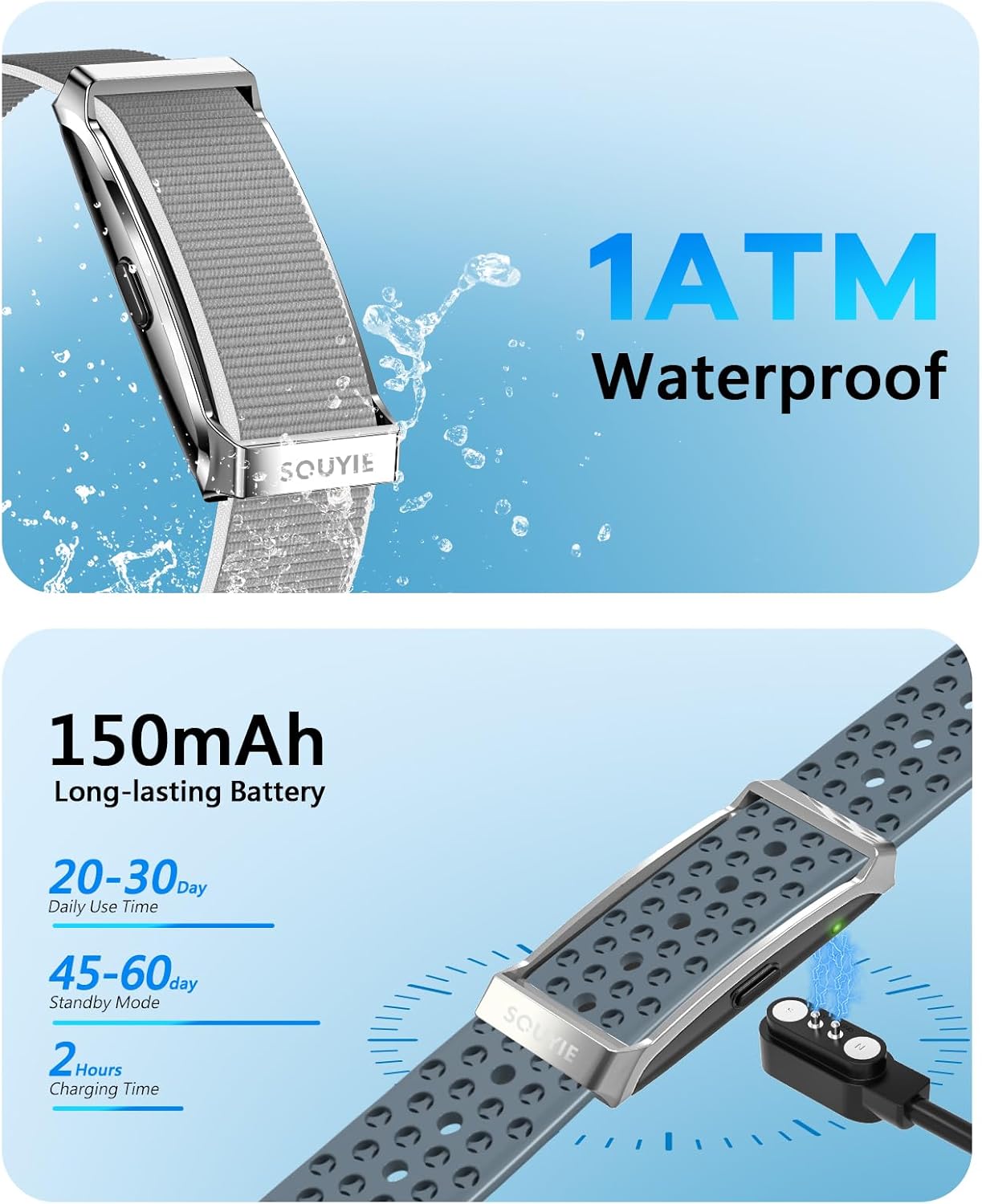 【Long Battery Life & 1ATM Waterproof】Solve your daily charging worries with the SOUYIE ultra-long 20-30 day battery life fitness tracker—designed for low power consumption and minimalist convenience. Built-in 1 ATM water resistance makes it easy to handle workouts, hand washing and active lifestyles. Enjoy uninterrupted, all-day health tracking without having to worry about frequent charging. Whether you’re sweating in the gym or caught in the rain, wear it worry-free as your always-ready health companion (It is not recommended to wear the watch when taking a hot bath, swimming, diving, or taking a sauna).