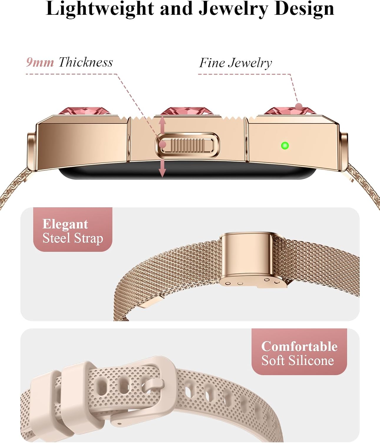 【Jewelry Design & Easily Versatile】 This jewelry smart bracelet, designed by a renowned designer, offers understated elegance. Its polished surface captures light, radiating a refined luster. Its ergonomic design fits snugly and comfortably. It also comes with two straps: brushed stainless steel and hypoallergenic silicone. From business meetings to evening socializing, it effortlessly complements any occasion, showcasing the wearer’s stylish taste and unique personality.