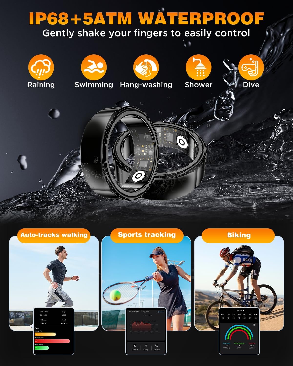 Fitness Tracker for Every Move: Whether you are running or swimming, this fitness ring has you covered. Rated 5ATM & IP68 waterproof, it withstands depths up to 50 meters. Tracks steps, calories, and distance accurately. Note: Please select the correct size using the sizing guide before purchase.