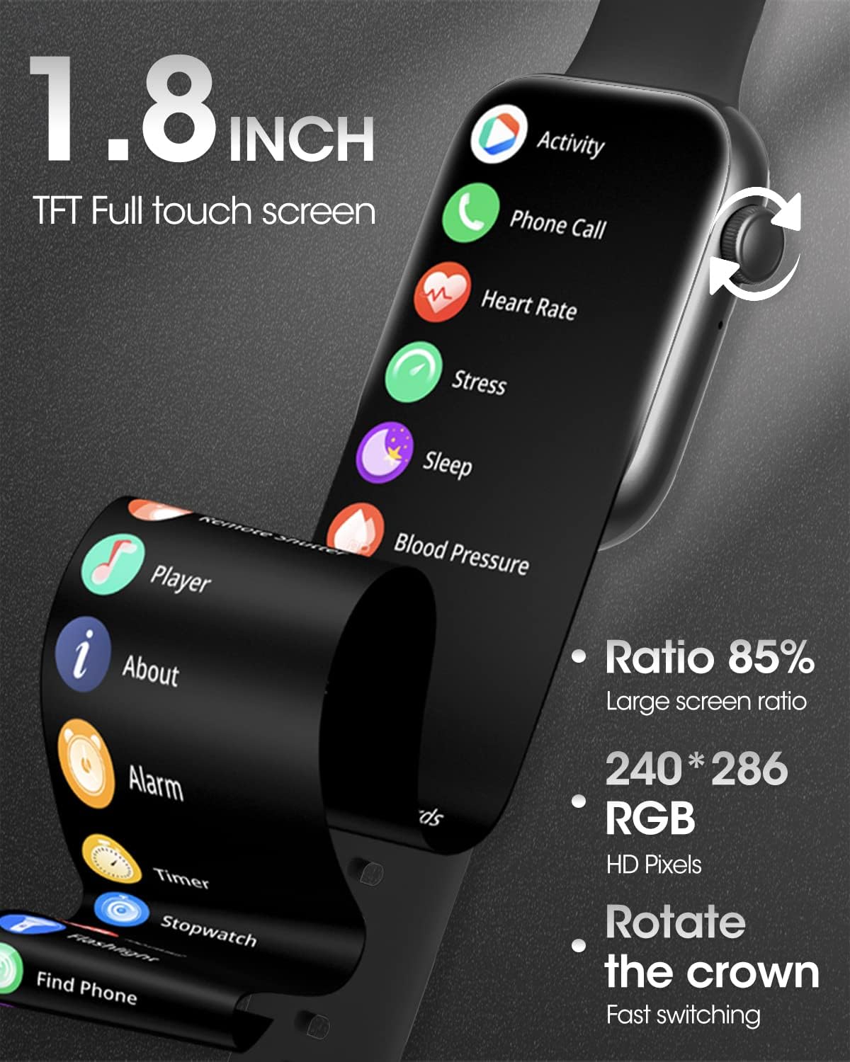 exceed your expectations men smart watch comes with 2 skin friendly silicone bands. The ultra stylish 8.8mm body is made of lightweight and durable zinc alloy, equipped with a 1.8 inch hd screen, screen ratio improved to 85%. Smarch is designed with a rotatable button on the side, which can be rotated to switch the watch dial and sliding menu, the fun arises spontaneously on your fingers. Access your world from wrist aooden smart activity tracker is compatible with android 4.4, ios 8.