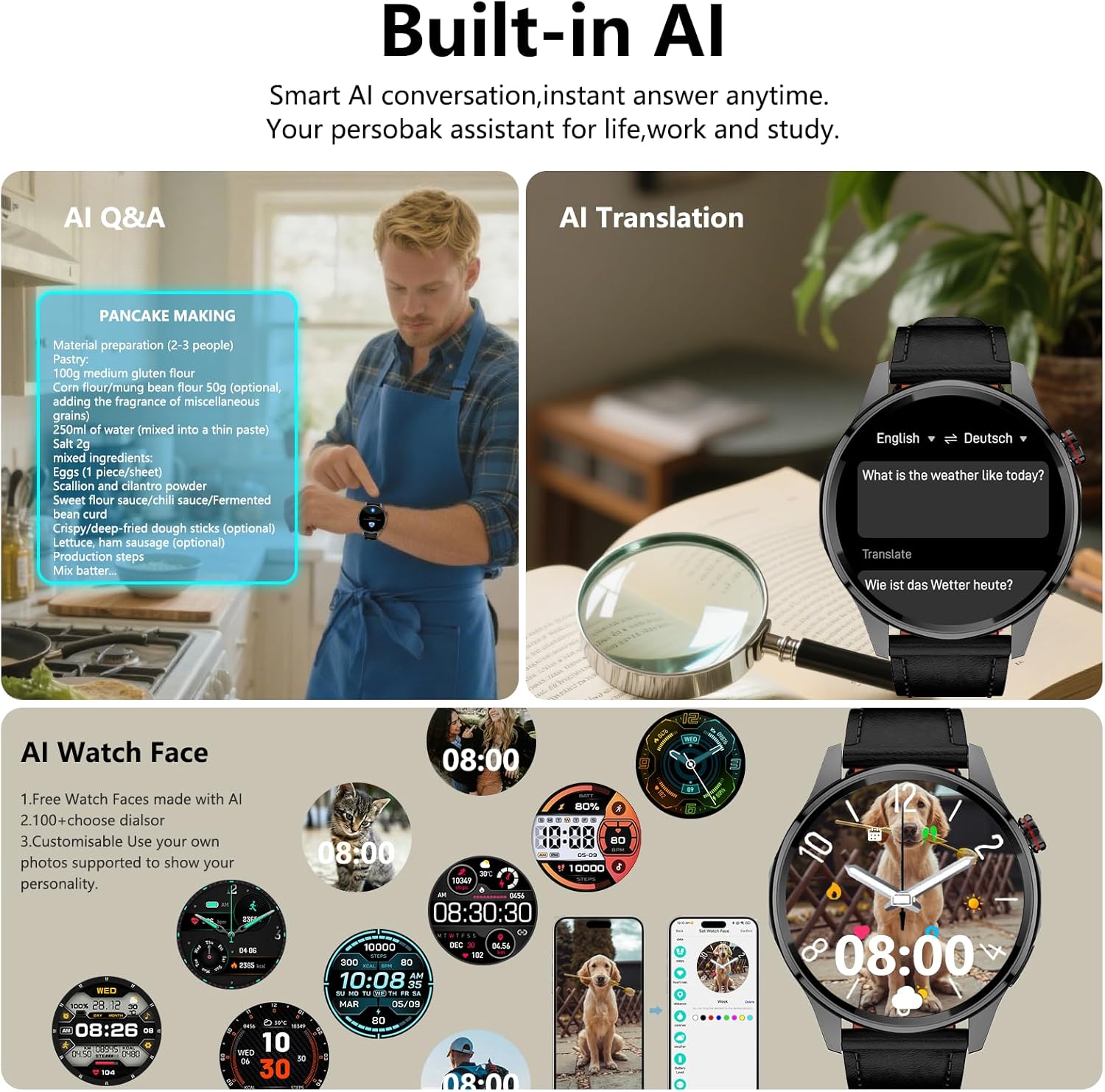 【1.46” HD Touchscreen and 2 bands】-This smartwatch for Men/women offers crisp visuals and highly responsive touch sensitivity. Premium materials for a durable design that blends style and sport style. Scratch-resistant, impact-resistant, and exceptionally drop-resistant.Durable leather strap and comfortable silicone watch strap in the package, you can change different watch straps according to different needs.