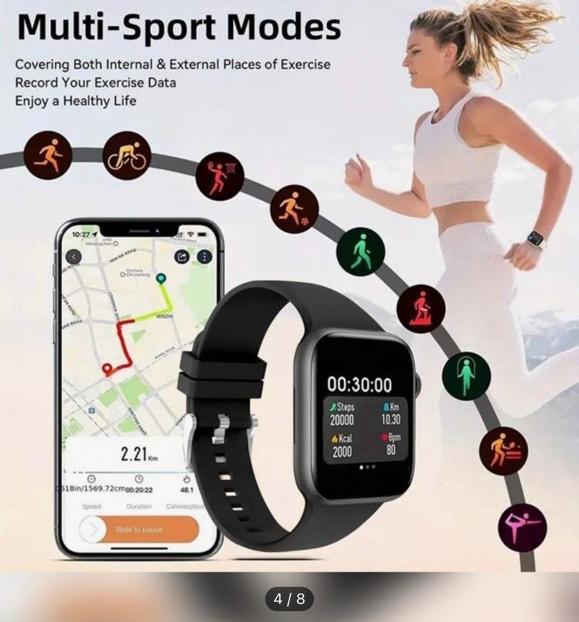 feature-packed smartwatch designed to enhance your everyday life. The watch supports Bluetooth calling, allowing you to make and receive calls directly from your wrist, giving you the convenience of staying connected without reaching for your phone