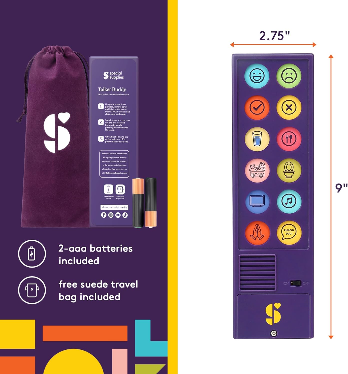 Talker Buddy by Special Supplies is an advanced AAC (augmentative and alternative communication) device that is designed to help non-verbal individuals to communicate effectively, regardless of their language or cognitive abilities. The device comes with a wide range of pre-installed vocabulary, including common phrases, words, and sentences, that can be used in different situations. Additionally, the device has an option to record and add your own words and recordings, allowing users to customize the device to their specific needs, providing a more personalized and effective communication experience. The device comes with a soft touch interface that is easy to navigate and operate, making it accessible for individuals with autism, stroke, or other special needs, both children and adults. The device also comes with a travel bag, making it easy to take on the go for therapy sessions, home-schooling, traveling, or other activities. It’s also suitable for use in hospitals, providing a valuable communication tool for patients who are unable to speak. The device is designed to be used by speech therapists, hospital staff, and other professionals, as well as by parents and caregivers of non-verbal children and adults. Talker Buddy is a powerful communication tool that can help individuals with communication difficulties express themselves and improve their speech, providing them with greater autonomy and independence in different settings and environments. Help them Talk & Communicate with our Talker Buddy AAC speech communicator!