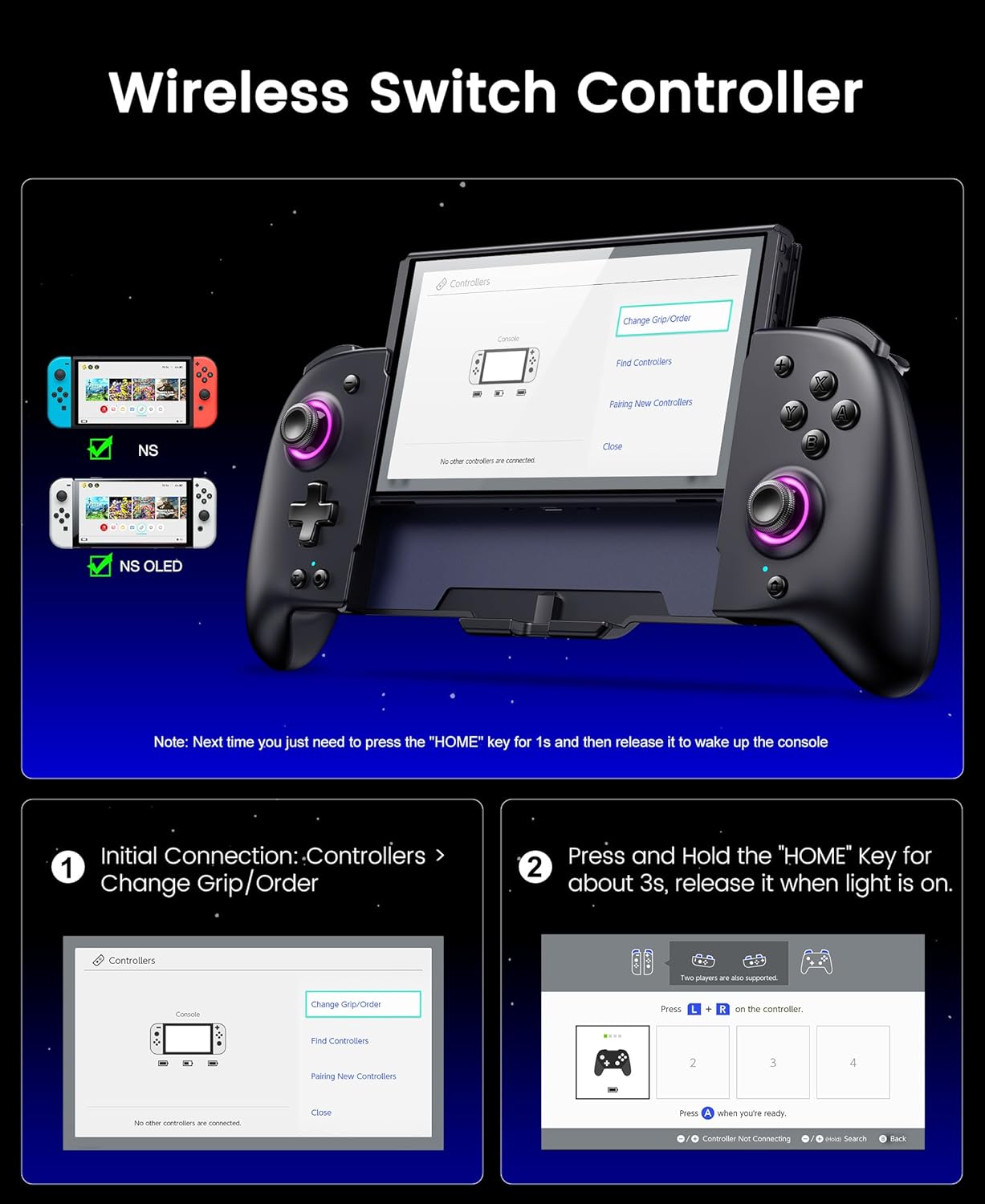 Works really well. Color changing comfortable feel. Rechargeable and holds a charge for a while. Bluetooth connects so if your joycons no longer connect this is the perfect solution.