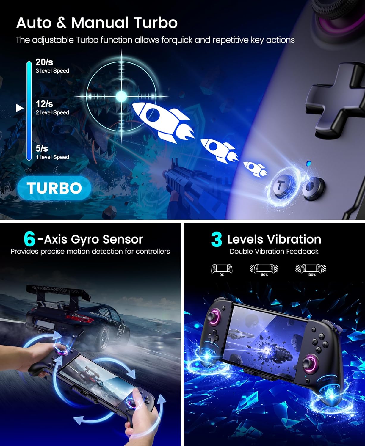 Ultimate Gaming Immersion with One-Piece Joypad – Our switch controller features 6-axis gyroscope that can detect the tilt allowing precise aiming and movement. The dual vibration motor provides excellent feedback with 3 levels of accuracy, enhancing your gaming experience even further. The turbo switch handheld controller offering 3 selectable speeds: 5/s, 12/s, and 25/s for lightning-fast attacks that gets you one step closer to victory