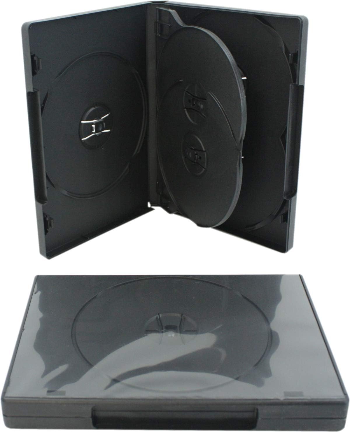 These are 10 individual BLACK Five Capacity DVD boxes! These boxes have a full wrap around sleeve (this is where you slide the front paper / artwork into so it shows). They hold 5 discs in the space of 1 chubby DVD box. Two DVDs are held on the sides of the case and another three are held in two hinged center flaps. The cases are 22mm thick (a.k.a. .87″). The hinged trays can be removed to make these a double, triple, or quad DVD box.