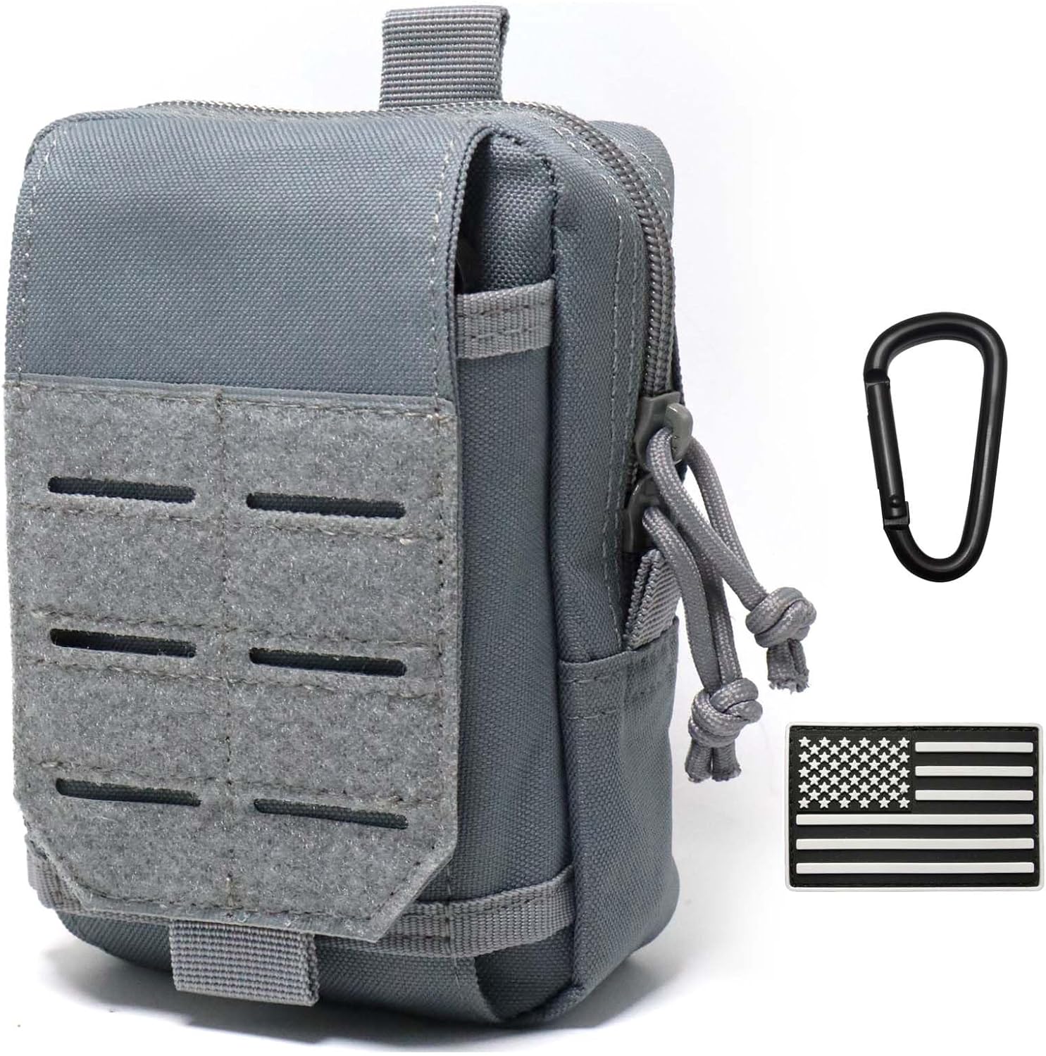 Molle Utility Pouch Practical Fashion Design: Front laser-cut hook & loop molle/pals system, Small tool pouch utilized the stackable laser cut front + loop material Molle platform for storing additional tools, mounting memorable patches, adding customization/tactical ID, attaching additional MOLLE gear. The free U.S.A flag patch and aluminum D ring carabiner make the pouch more conspicuous and fashionable.