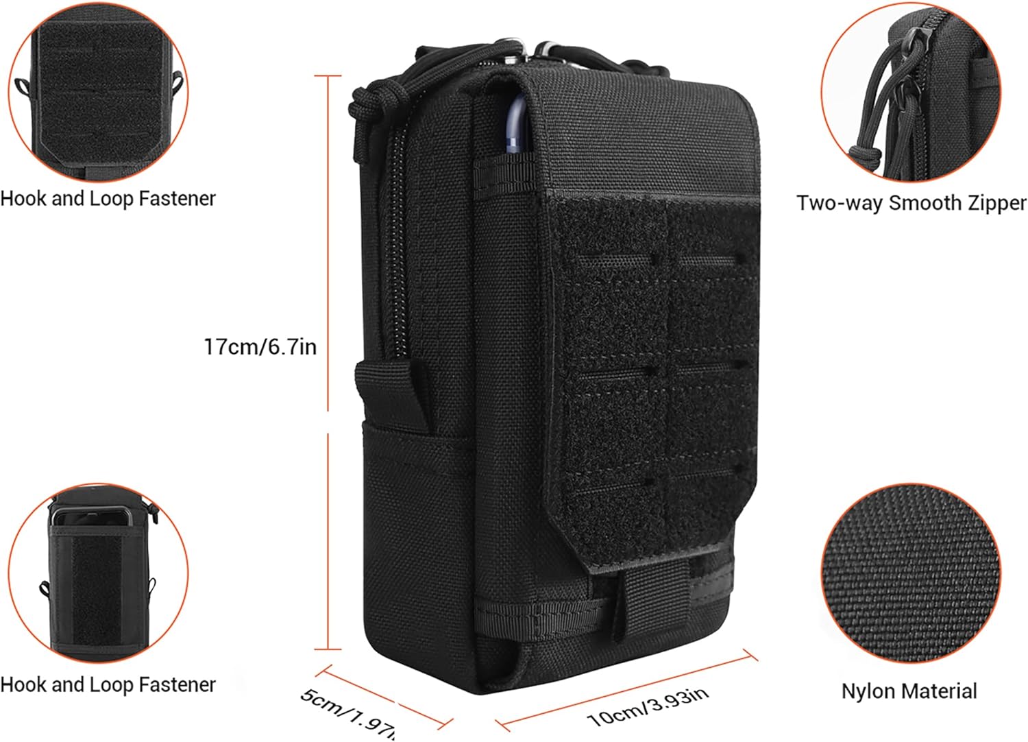 Molle Phone Pouch front laser-cut hook & loop molle/pals system: small tool pouch utilized the stackable laser cut front + loop material molle platform for storing additional tools, mounting memorable patches, adding customization/tactical id, attaching additional molle gear. the free u.s.a flag patch makes the pouch more conspicuous and fashionable.Tactical phone pouch rugged nylon material with soft inner interior: molle pouch constructed by durable premium 600d nylon fabric. the middle pocket is made of shockproof soft velvet padded interior lining protect your smartphone and cards in any outdoor condition.EDC Pouch Organizer Multiple pockets: edc utility pouch have one main zipper pocket, inner compartment, and mesh pocket, allow you storage small gadget. another magic sticker closure phone pocket can be easily put into your cell phone.Military tactical waist bag molle system: edc pouch has strong webbing belt loops on the rear, could be deadly hard attached to the tactical backpack, combat vest, belt or other tactical gears as an extra exterior pouch or carry it as a normal pouch to secure essential gears. size: 6.7″ * 4″ * 2″(h*l*w)Utility EDC pouch keeps contents safe: securely holds small tools and accessories like, phone, card, pen, pliers, mini flashlights, screwdrivers.