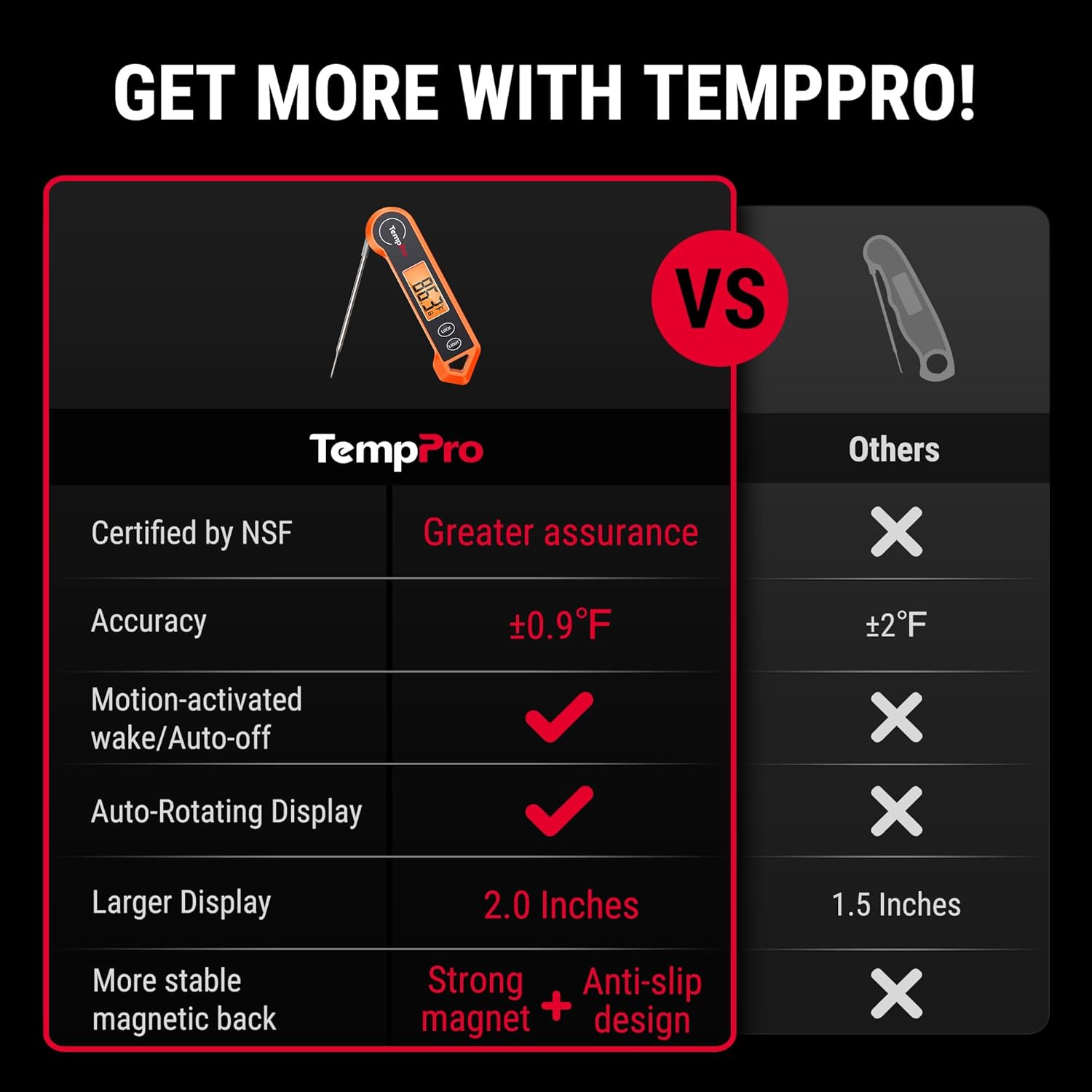 2.0 inches large auto-rotating backlit display: Digital food thermometer has a 180° auto-rotating backlit display, making this kitchen thermometer perfect for left-hand users and allows you to use it in low light conditions