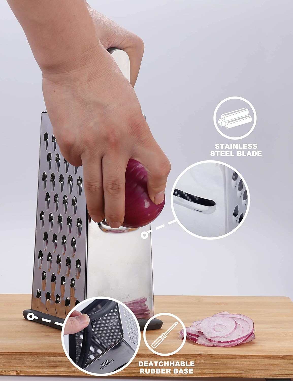 [EASY HAND WASHING BUT ALSO DISHWASHER SAFE] In the case of handwashing, you can simply clean it under running water. And if you own a dishwasher, things became easier–what you need to do is put this box grater in the machine! Please be aware that, we recommend you take the removable rubber base off before washing it. This will make sure you clean all the mess that may hide in the rubber base and farewell to the risk of any rust happening.