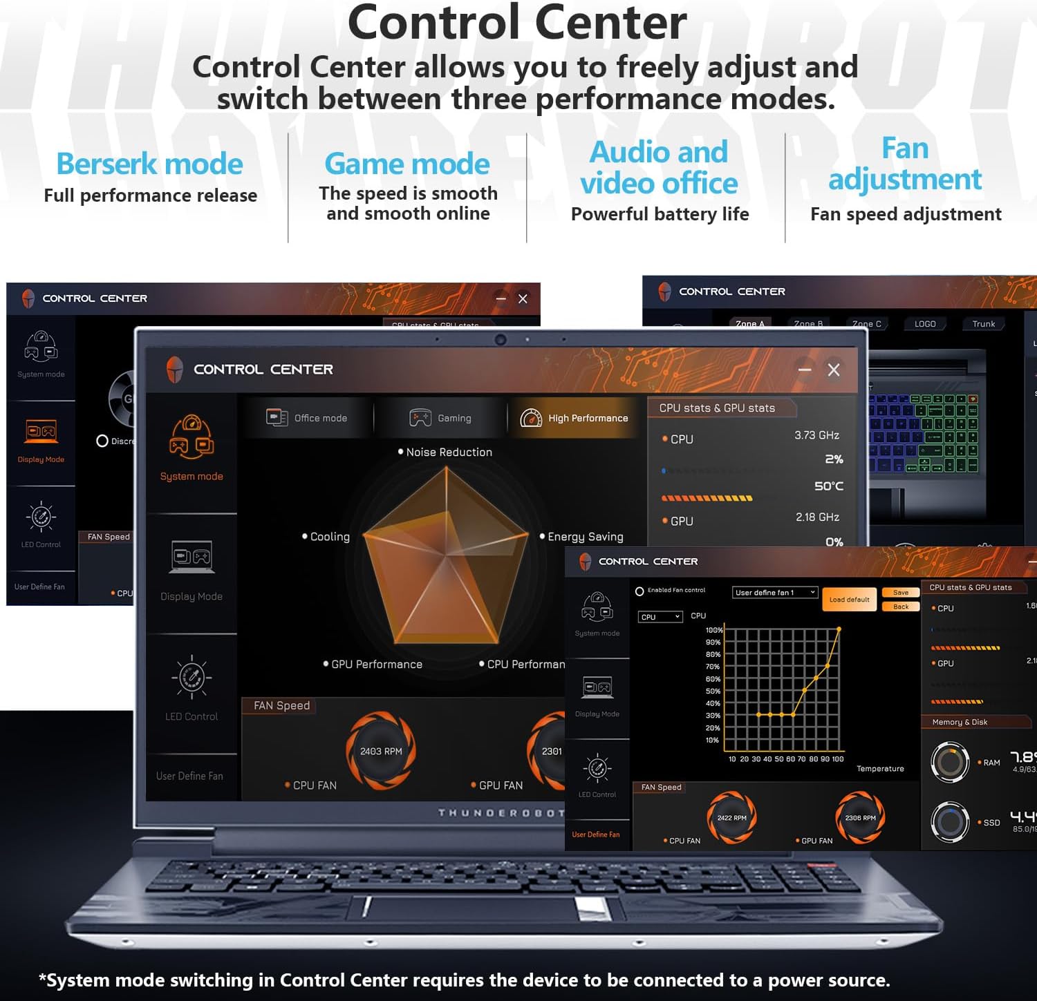Yes. You can customize performance modes, keyboard lighting, display settings, and fan control through the Control Center. Some models support per-zone/per-key RGB Customization. When switching system modes, ensure the device is plugged in.