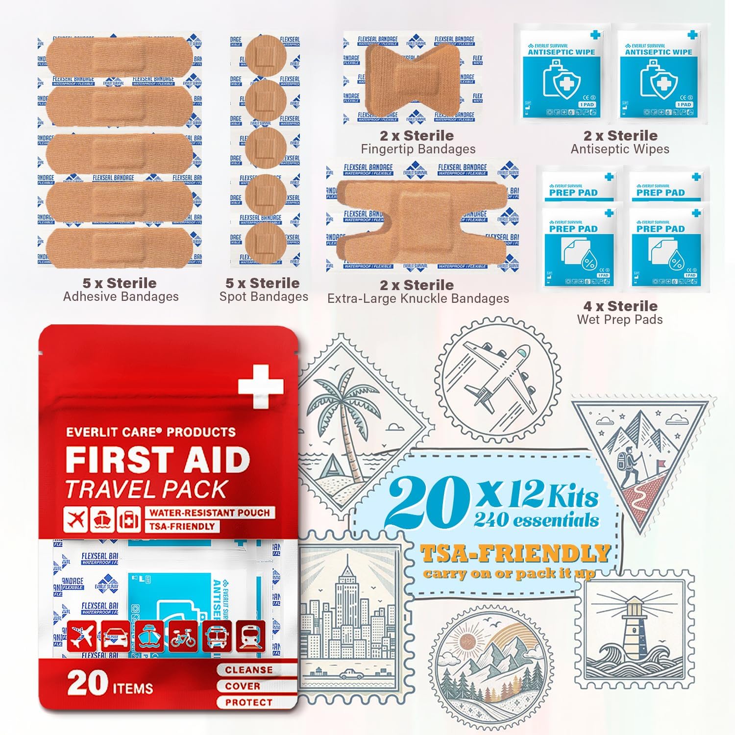 7 reviews for Travel Bandage Pack | 12 Individual Packets, Bulk Portable Mini First Aid Kit with 20 On-The-Go Essentials | Compact Water-Resistant Reusable Pouch to Clean, Cover & Protect