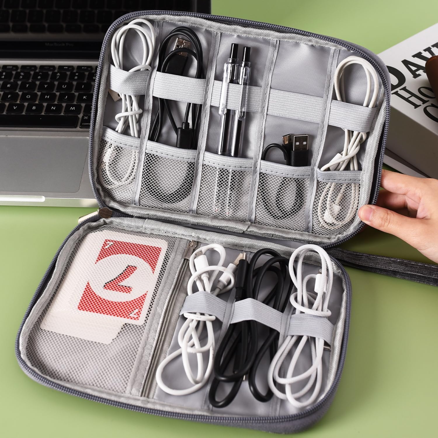 With 8 compartments and a zipper net pocket, this bag provides dedicated spaces for all your essentials, from chargers to cables, making it easy to find items without searching.