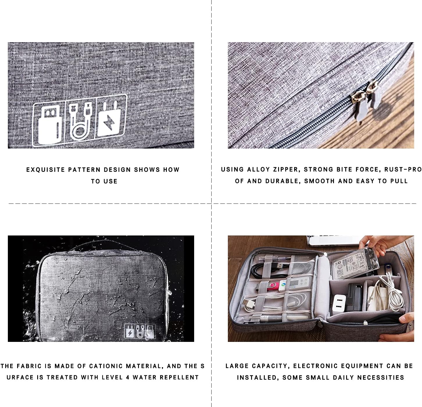 Durable and Water-Resistant Material: Made from high-quality, water-resistant fabric, this electronics organizer offers robust protection against spills and moisture. The durable construction ensures that your devices and accessories are safe from environmental damage, making it an ideal choice for both everyday use and travel.