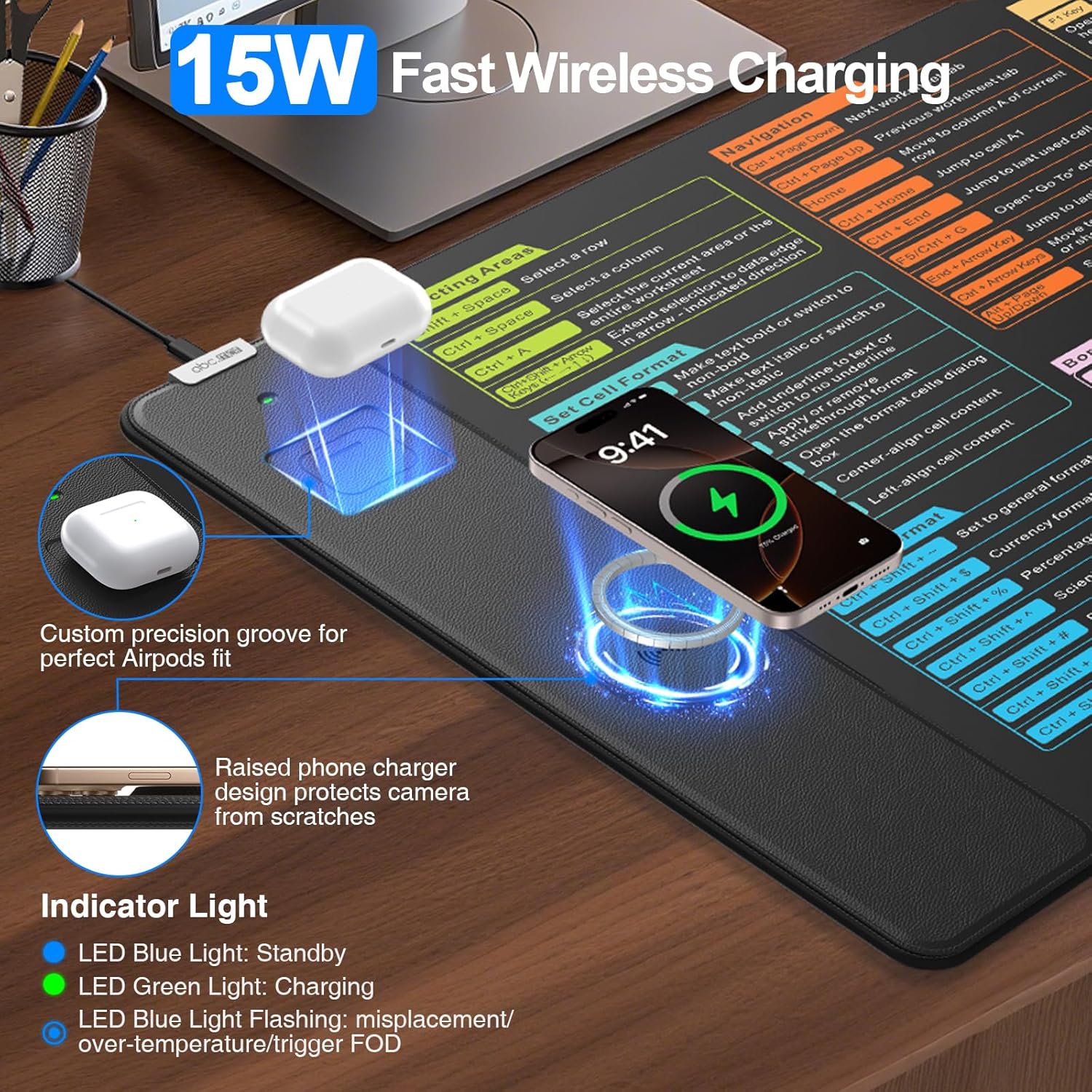 【4-in-1 Wireless Charging & Extended Office Mouse Pad】Maximize efficiency with an extra-large 31.5″x15.8″ surface featuring 15W fast magnetic phone charging, a dedicated 5W AirPods spot, a smooth mouse zone, and Excel shortcut guide—all designed to streamline your workspace