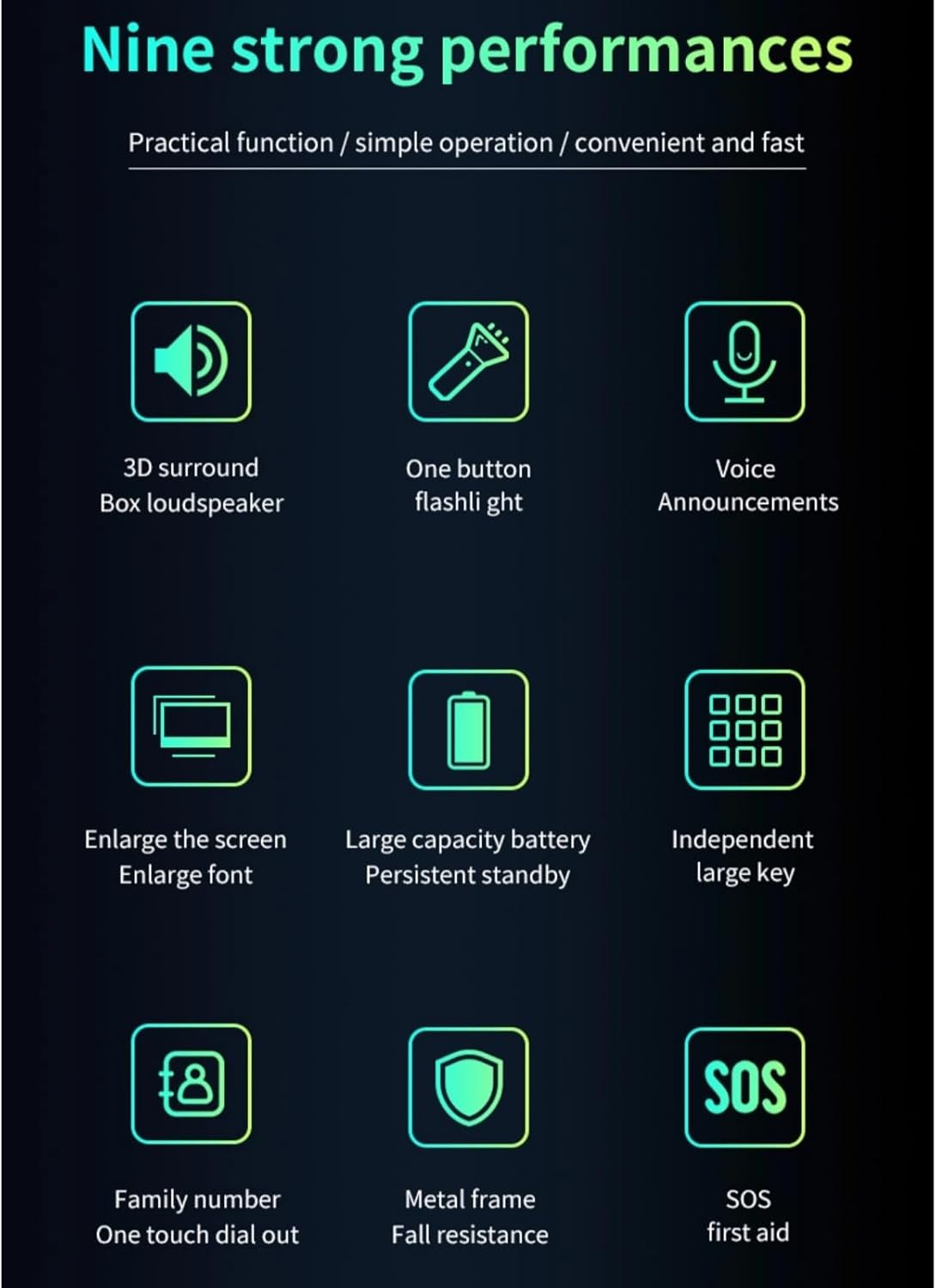 SOS Key Advanced Phone: If you encounter an emergency, you can use the SOS function to get immediate help, SOS emergency call, you can set up 9 emergency contacts, and you can dial with one key without flipping through the address book.